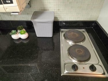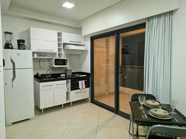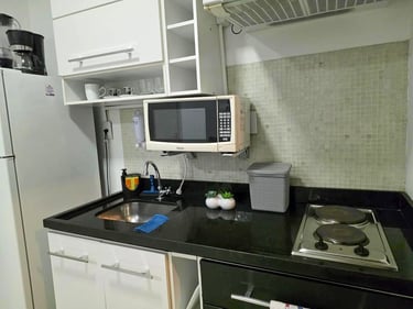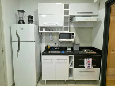 Cozinha equipada com geladeira, cooktop, micro-ondas e utensílios completos
