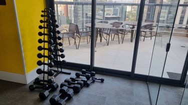 Piscina e academia no 23º andar, com vista panorâmica da cidade