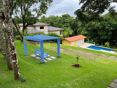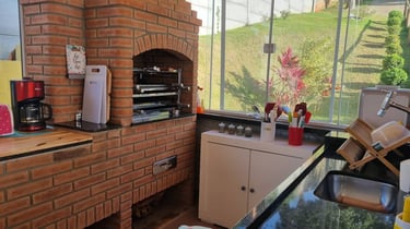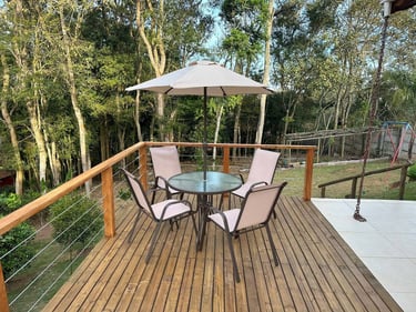 Jardim, piscina, churrasqueira, bosque, redário, fogo de chão e balanço para criança