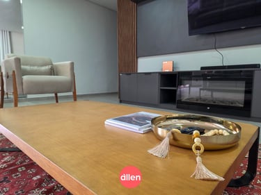 Sala com sofá, Smart TV e lareira elétrica